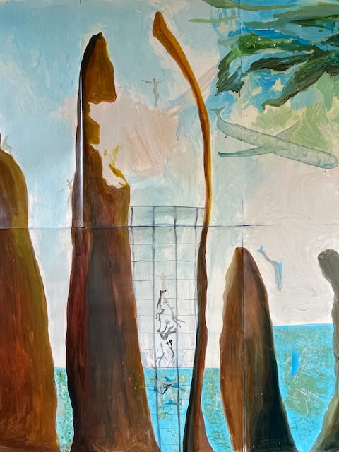 I loaded my brush and dropped a big thick heavy prison right into the middle of my pastel lagoon. Wide bars and people climbing them and then a dolphin and above that some other people climbing the rocks, diving off the rocks, and suddenly I was out of prison.