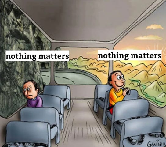Day 17: Nothing mattersor nothing matters!Lindsay Jean ThomsonMar 10, 2026∙ Paid133ShareHello, friends—There’s a hundred different versions of the “nothing matters” or “nothing matters!” meme. Same words, completely different energy.Some of your friends and family might be asking you ab…Continue reading this post for free, courtesy of Lindsay Jean Thomson.Claim my free postOr purchase a paid subscription.PreviousNext