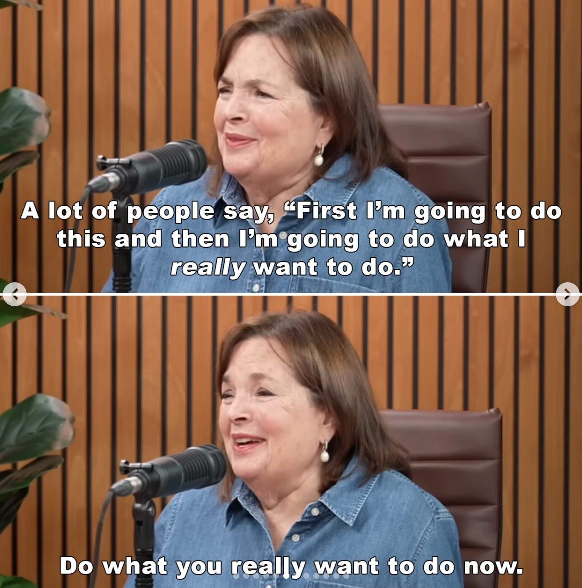 Day 18: Do what you really want to dodo it nowLindsay Jean ThomsonMar 11, 2026∙ Paid132ShareHello, friends!“A lot of people say, ‘First I’m going to do this and then I’m going to do what I really want to do. Do what you really want to do now.” — Ina GartenDo what you really want. Yes!Someti…Continue reading this post for free, courtesy of Lindsay Jean Thomson.Claim my free postOr purchase a paid subscription.PreviousNext
