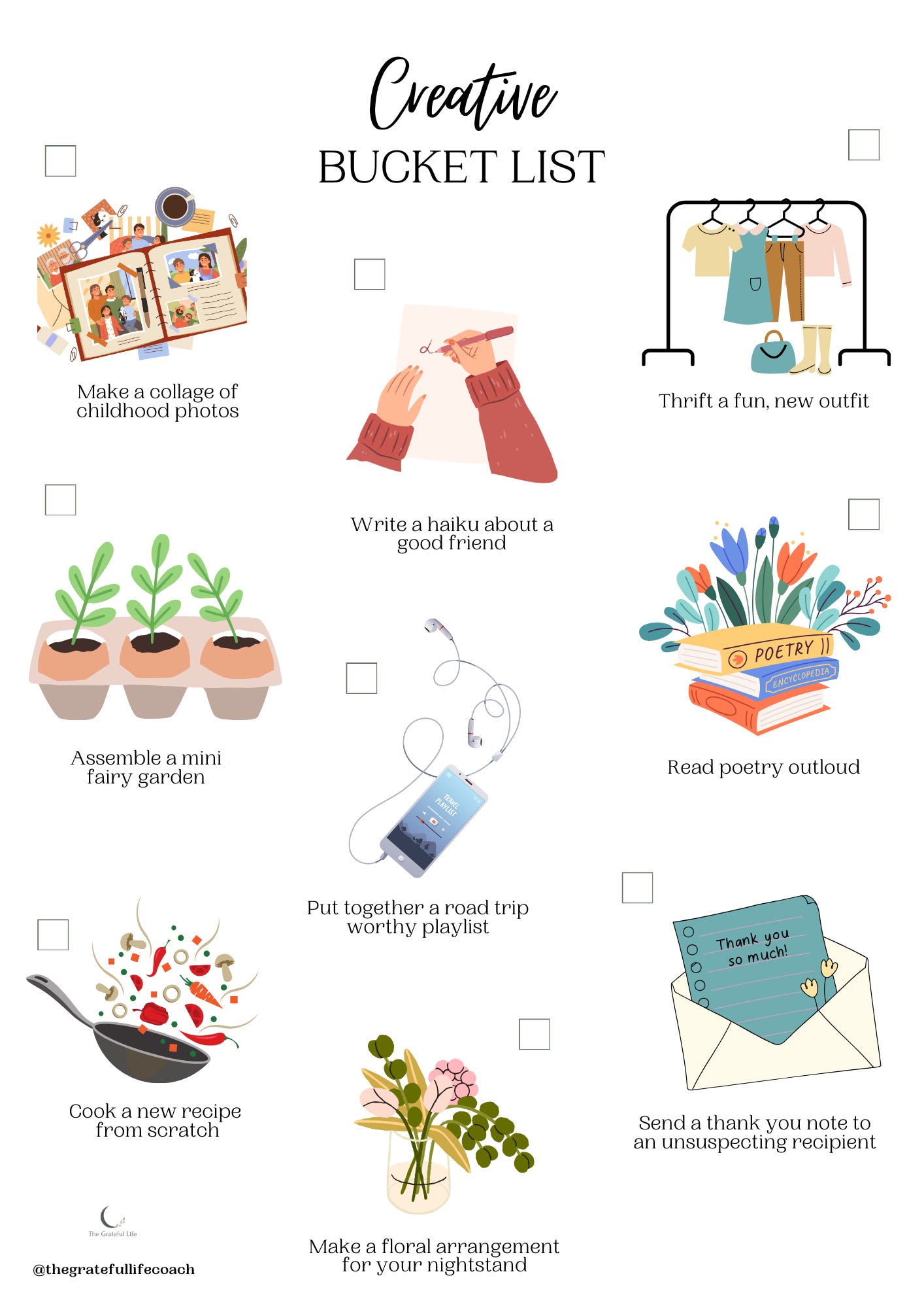 I made us a little creativity “bucket list” to help shake off stagnant energies this week (or next, or the week after). I’ve always found that allowing myself to play in a different space helps me re-meet my goals with fresh eyes.