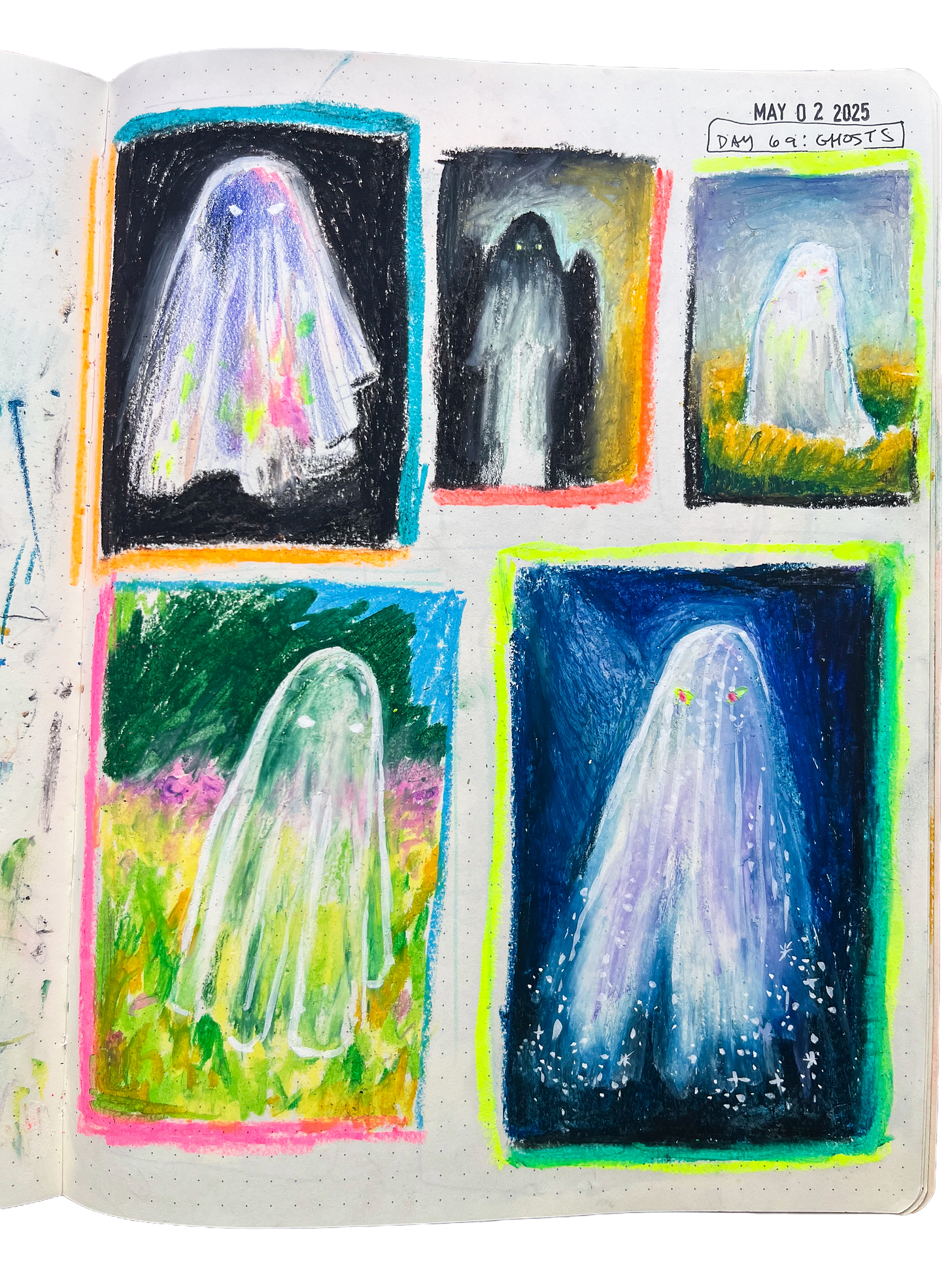 I would say pick an idea/medium/format that activates delight and curiosity for you—as opposed to choosing something you feel like you should do or get better at. After finishing a sketchbook page, I would often (not always, but most of the time!) be delighted by what I had created which gave me a sense of satisfaction, and then curiosity about what I could come up with the next day kept me wanting to come back to the page.