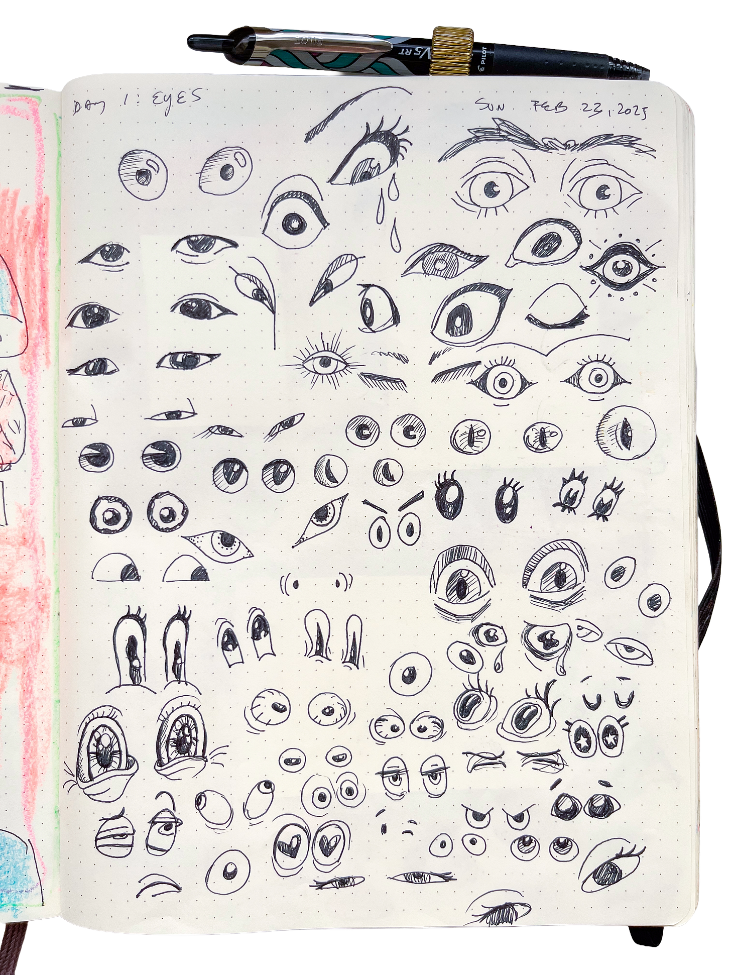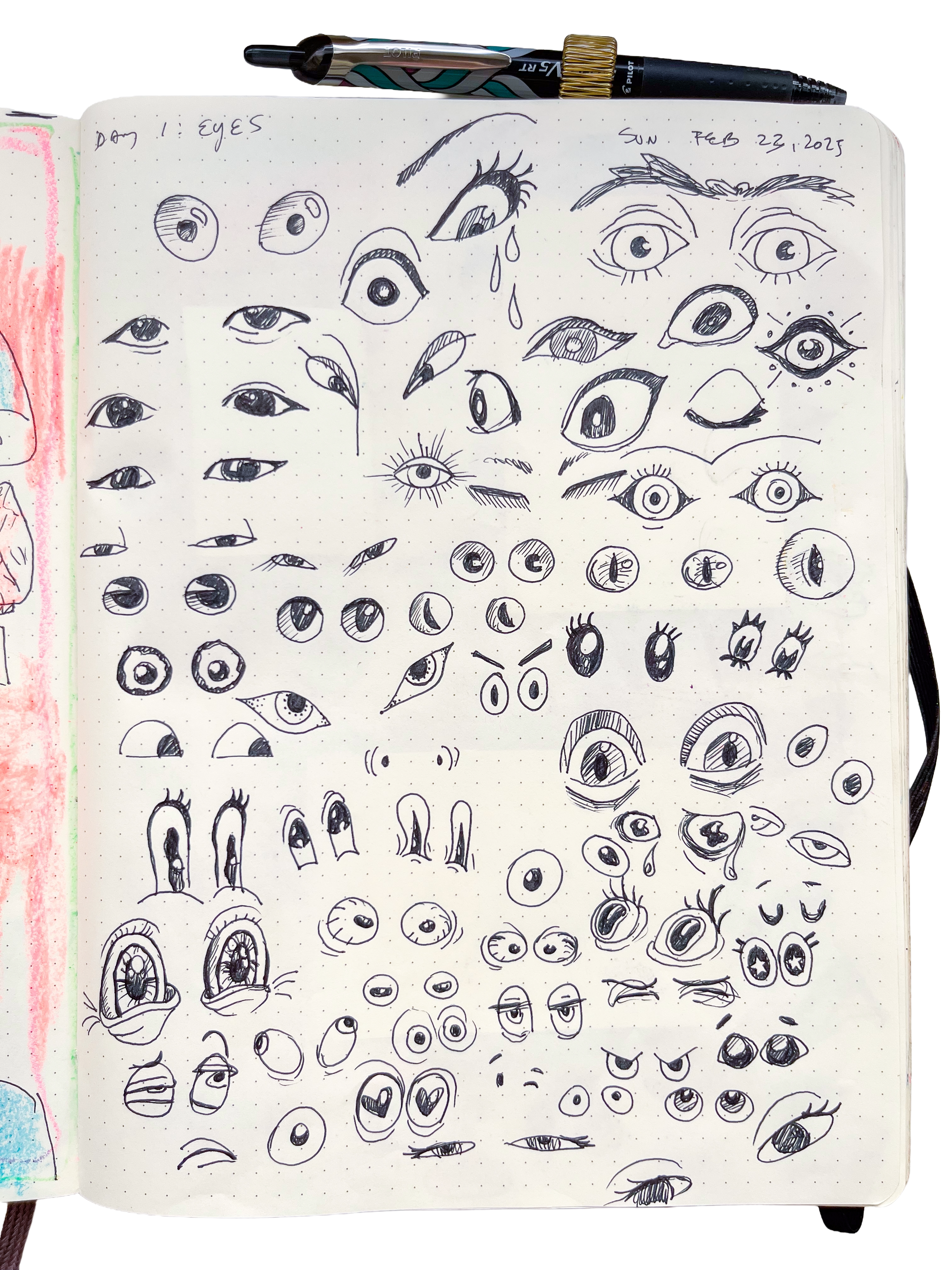 I liked giving myself weekly prompts so I could use the 7 days to thoroughly explore or iterate on an idea. For example, the first week’s theme was body parts, so each day was drawing lots of different eyes, then hands, then mouths, feet, etc. Through the practice of researching lots of different reference images, and then drawing my own version of them, it felt like “doing reps”, just low pressure allowing myself to try lots of different ideas so I could have a larger visual vocabulary to pull from in the future whenever I need to brainstorm something.